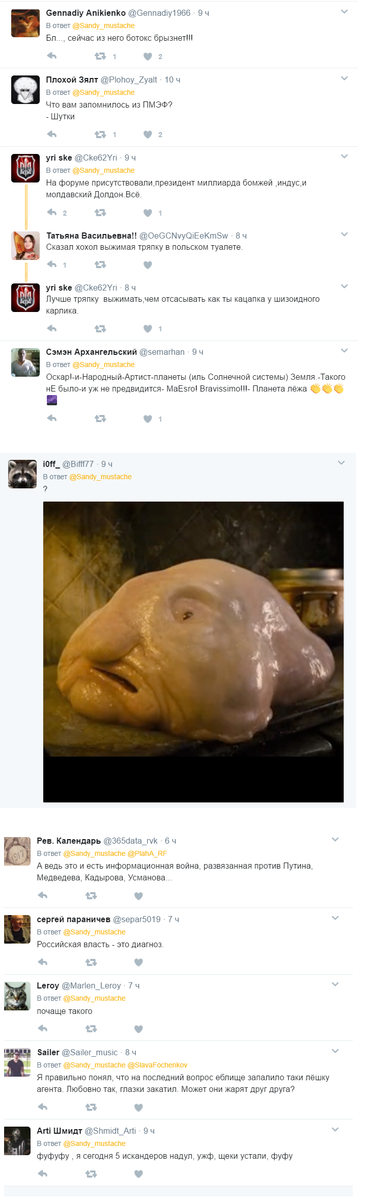 У участников Форума все на лице написано. Владимир Владимирович отвечает лицом на самые актуальные вопросы политического момента. pic.twitter.com/p4JzB1csLY— Усы Пескова (@Sandy_mustache) 3 июня 2017 г.